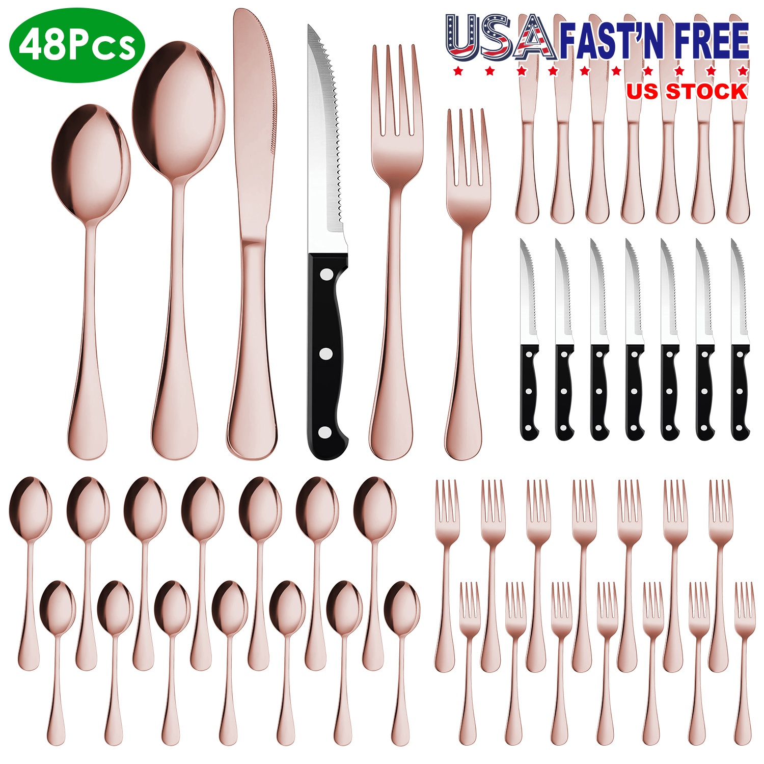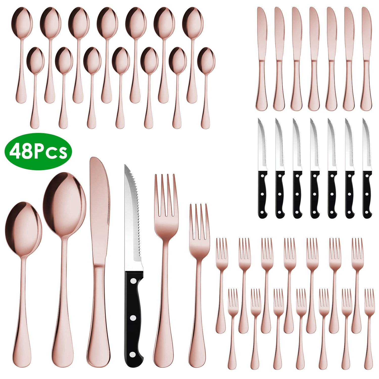 Our 48Pcs Silverware Set including 8 dinner forks, 8 salad forks, 8 dinner knives, 8 steak knives, 8 dinner spoons and 8 tea spoons, able to serve for 8 people, is great for family daily use, entertaining guest, wedding or other occasions. Made of 410 stainless steel and processed with vacuum electroplate technology, it\'s smell-free, rust-resistant, sturdy, not able to bend, and with smooth edge which makes you use it without worry. It\'s dishwasher safe, and easy to clean. Rose gold/ silver/ black colors are optional, perfect gift for your friends, newlyweds or new homeowners in Thanksgiving Day, Wedding, Party and events.