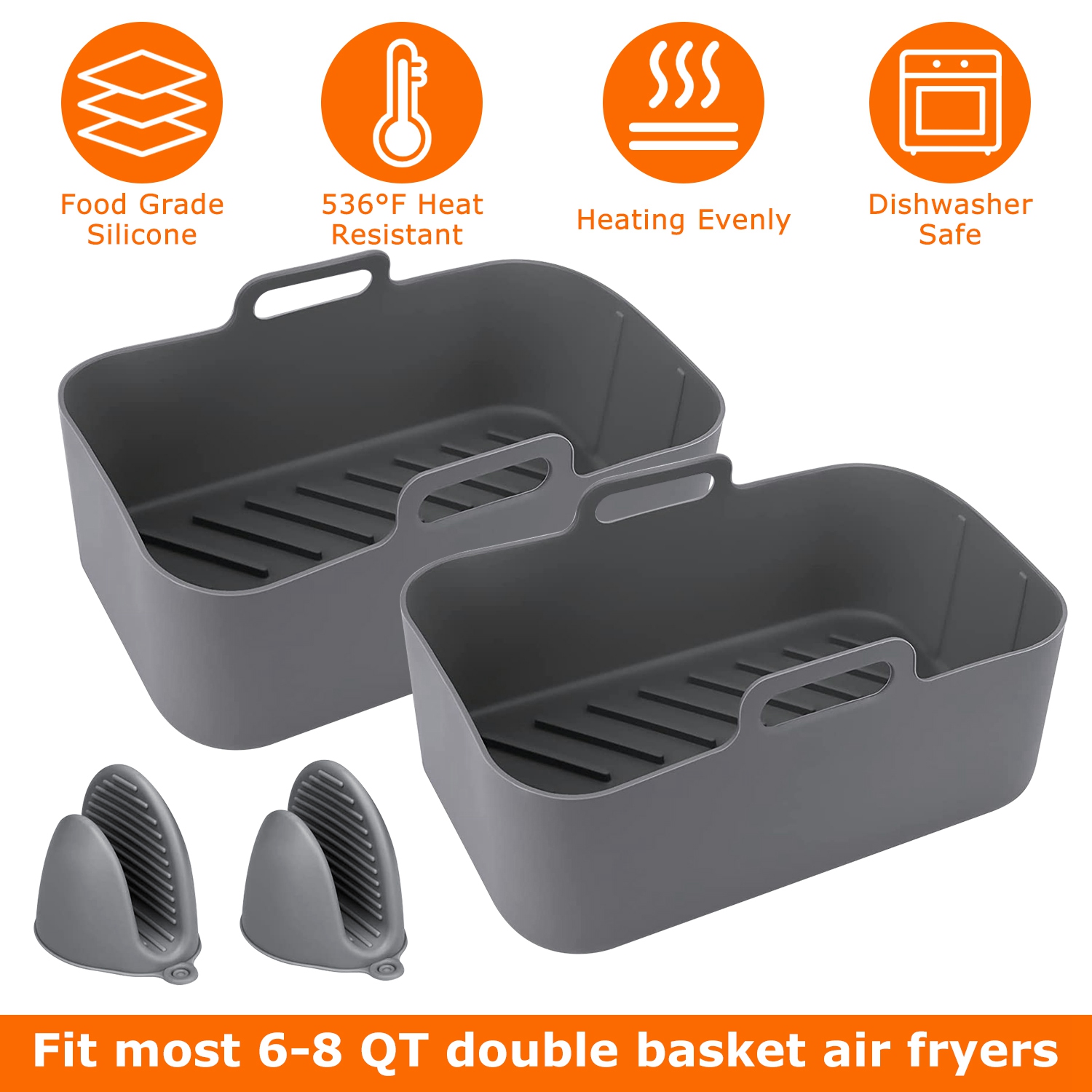 Reusable Air Fryer Silicone Pot Rectangle Replacement of Parchment Liners 2 Basket Pans with 1 Pair of Mittens for 6-8 Quart Oven Air Fryer