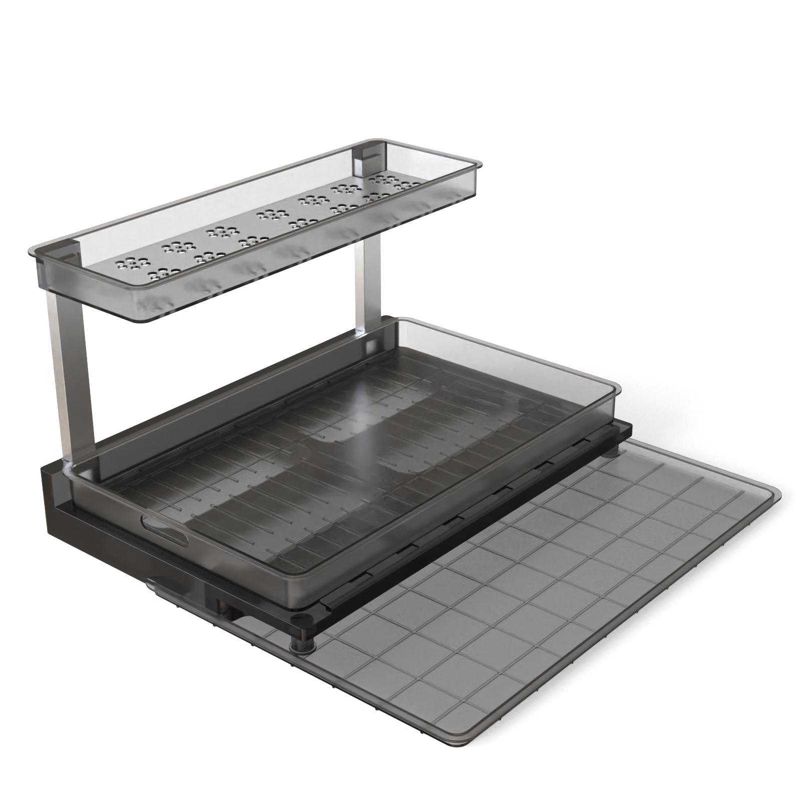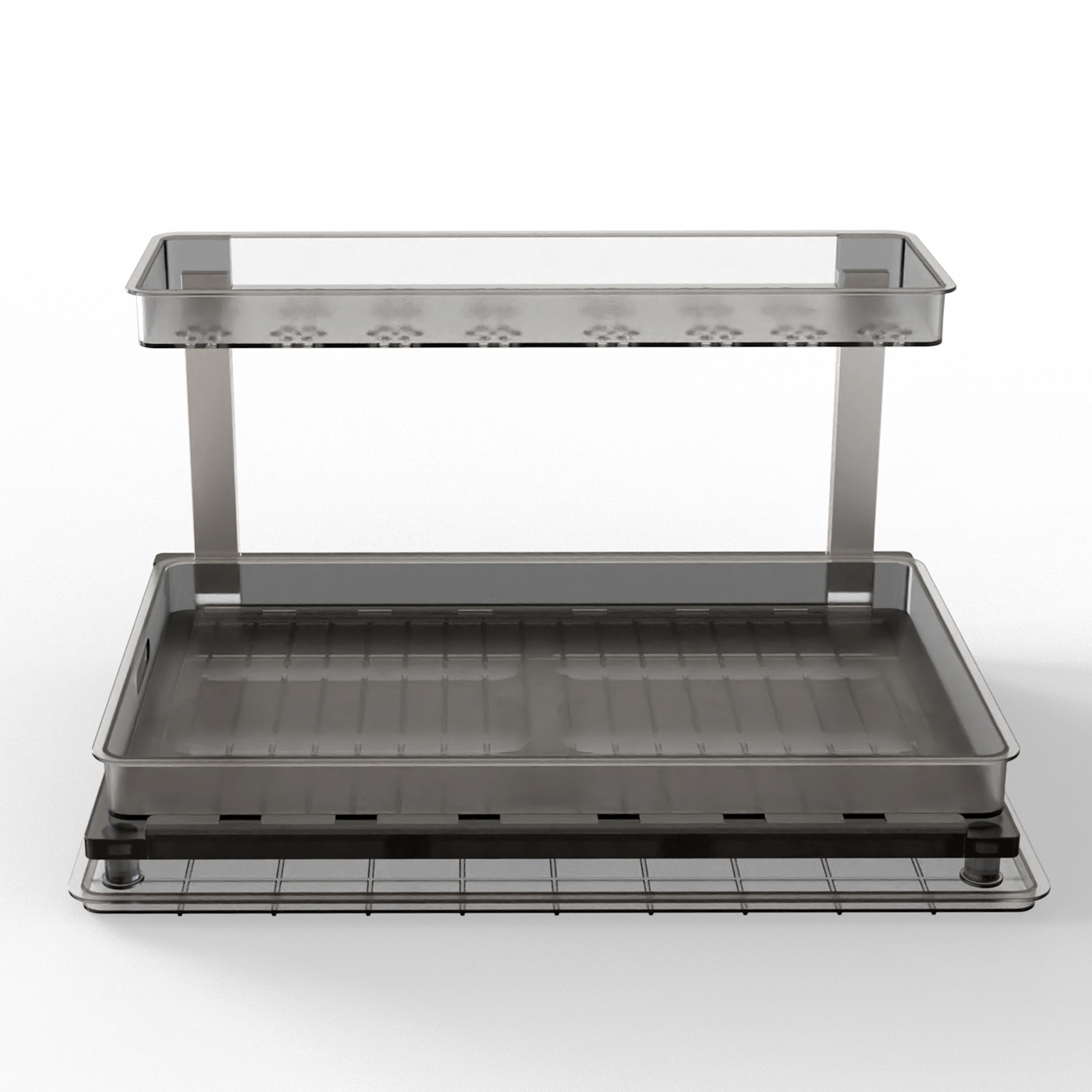 Our 2-tier under-sink organizer maximizes storage space with its unique L-shaped design, efficiently use vertical space while fitting snugly around plumbing fixtures. Perfect for storing cleaning supplies in various locations like bathrooms, kitchens, food pantries, and offices. The upper fixed basket keeps smaller items easily accessible while the bottom sliding-out basket allows effortless access to heavier essentials from both sides. Constructed of thickened PET material, stainless steel pipes, it\'s sturdy, rustproof, and has great loading capacity. Additionally, the top basket features hollow design providing excellent drainage. The assembly process is rapid and tool-free, use stainless steel pipes to connect the upper basket with base and insert the drawer tray, instant setup within minutes.