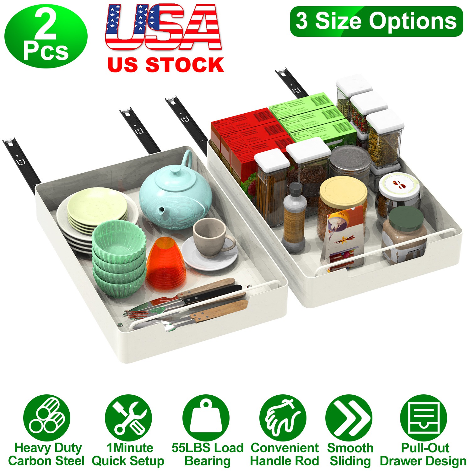 Home > 2Pcs Pull Out Cabinet Organizers Sliding Shelf Spice Rack Carbon Steel Roll Out Drawers Fixed with Adhesive Nano Film with Handle 55LBS Max Load