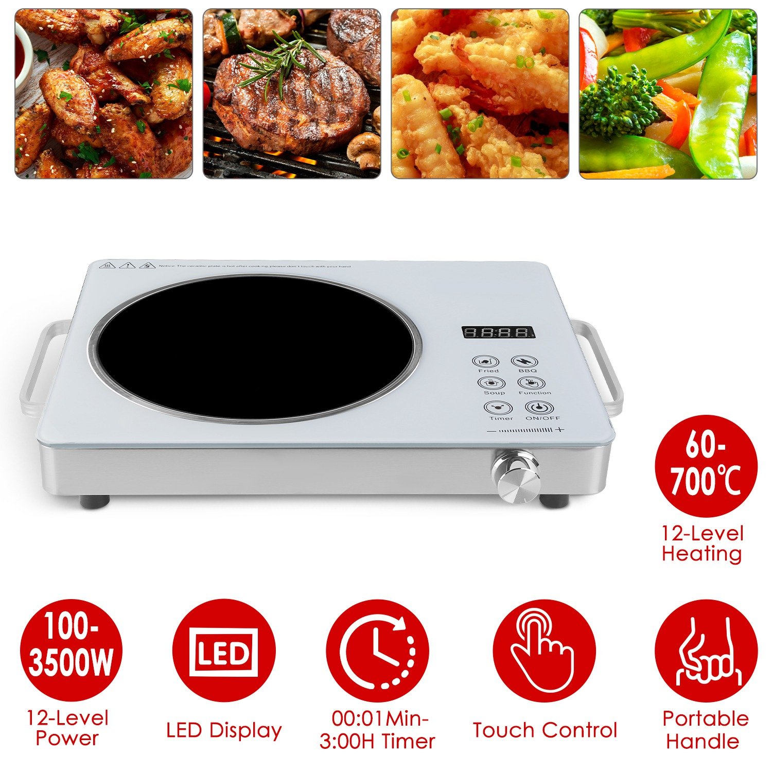 Mode: Fried(Default 3500W), BBQ(Default 650℃/1112℉), Soup(Default 550℃/932℉), Function(Default 1400W), Timer(00:01Min-3:00H), ON/OFF